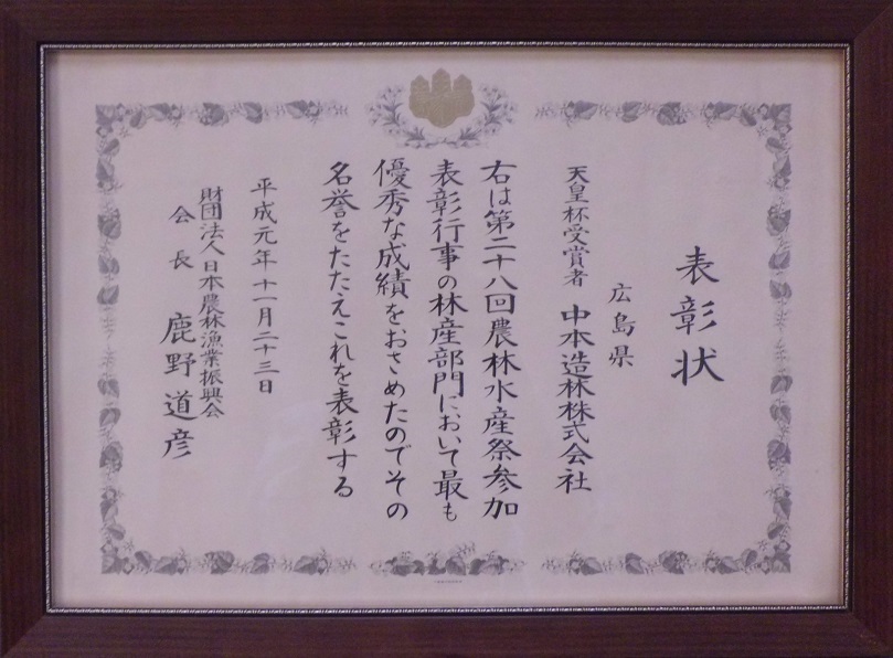 1989年に第28回「農林水産祭天皇杯」受賞、「農林水産大臣賞」林業経営部門受賞。2006年に日本の生態系などに適した森林認証制度「緑の循環認証会議(SGEC)」認証取得。2019年、国際森林認証制度PEFC-CoC認証取得。
