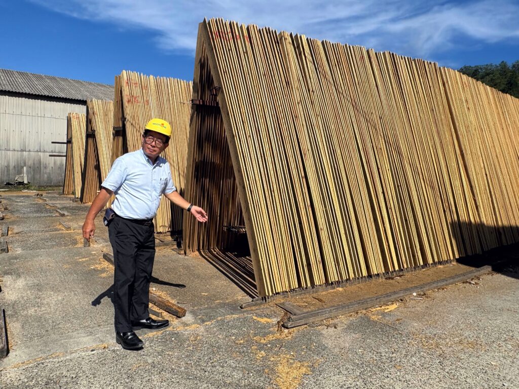 名だたる住宅店舗用資材メーカーの中で、我々のような小さな規模でも勝負させて頂くには「信頼」が大事です。国産・高品質・高付加価値にこだわり、中でも大きなこだわりのひとつが「乾燥」です。無垢材は特に数か月かけて丁寧に自然乾燥させることで高品質な製品に。現在では珍しくなった昔ながらの「縦干し(たてぼし)」だと、風通しがよく、雨水でアクが流れます。すべてが人力で、職人は大変ですよ。